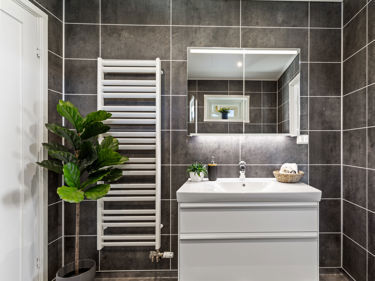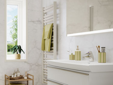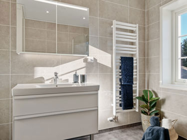 Fint, smart og praktisk. Bytt ut radiatoren på badet eller vaskerommet med håndklehenger i vannbåren varme. Holder varmen like bra, men gir deg samtidig varmehåndklær eller klær. Gjelder ikke i husmodellen Lasse.