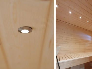 Skap stemning i badstuen med dimbare spotlights. Dette kan velges som et ekstra tilvalg til din badstue og gir en avslappende atmosfære med dempet belysning.