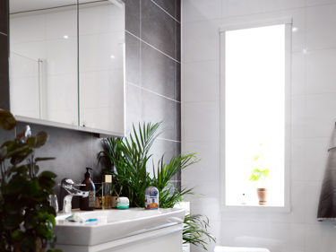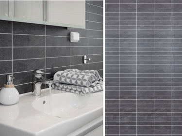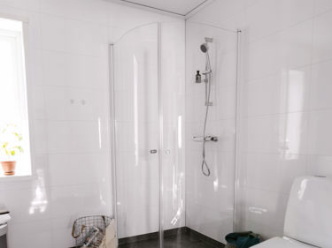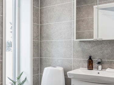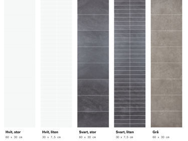 Flismønstrede våtromspaneler fra Fibo følger med som standard på våre baderom. Våtromspanelene har en vanntett overflate, er lettstelt og tilpasset for bruk i våtrom. Velg mellom fem forskjellige design. Finnes også som tilvalg til lille WC.