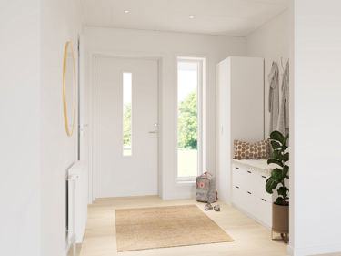 Ytterdøren Justina med vindu i klarglass er inkludert som standard i våre hus.
