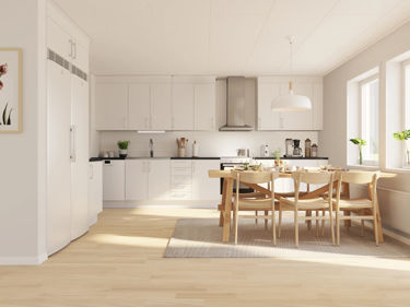 Velg en hvitlakkert, blank kjøkkenfront med faset kant. Den gir kjøkkenet ditt et lyst og moderne uttrykk. Pakkepris