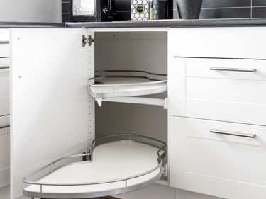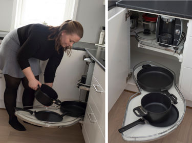 Praktisk uttrekkbart hjørneskap som gir lettere tilgang til for eksempel stekepanner og kjeler, og som utnytter plassen i hjørneskapet maksimalt.