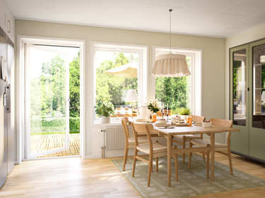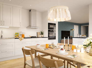 Hjertet i huset er den store og luftige stuen i en delvis åpen løsning med kjøkkenet. Her er det god plass til både middager, hobbyaktiviteter og fredagskos - og for den som ønsker enda flere møbleringsmuligheter, kan man sette opp en skikkelvegg som tilvalg. Det er også mulig å endre kjøkkenets planløsning ved å ta bort kjøkkenøya slik at du får kjøleskap og fryseskap inntil veggen mot vaskerommet og en helt åpen løsning mot stue.