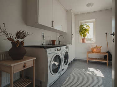 Stue og kjøkken har et enhetlig, fantastisk og åpent areal. Du har også god plass til å velge en kjøkkenøy og med tilvalget vridd kjøl/frys åpnes kjøkkenet ytterligere opp. Rett ved kjøkkenet har du direkte tilgang til vaskerommet med en egen groventré for gjørmete sko og bløtt yttertøy.