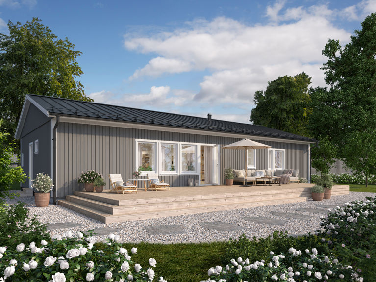 Som i alle våre 1-etasjes hus, finnes det også utvendige tilvalg på Mikael. Som for eksempel vår moderne takpakke som består av et 19 graders tak i en tidløs båndtekkemønstret plate. Da får du en mer moderne look på huset og et større inngangsparti med ekstra plass. Tenk så herlig å kunne nyte en god kopp kaffe i morgensolen.