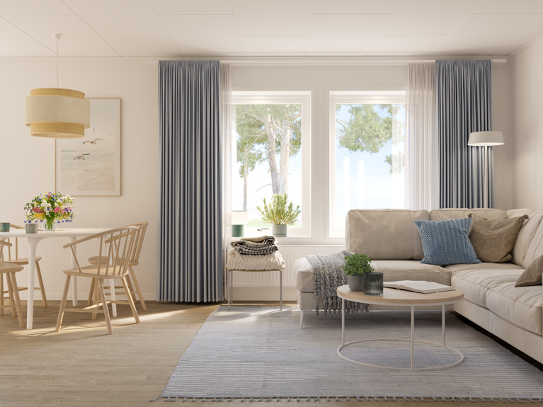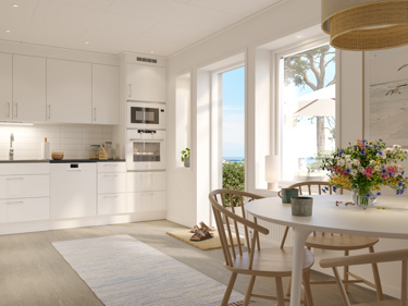 Den romslige og lyse kjøkken-/stue løsningen på 36,6 kvam byr inn til matlaging og spillkvelder med familien.