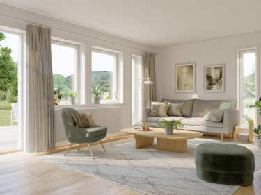 Vårt minste 1,5-etasjes hus har alt du trenger med sine åpne rom og smarte løsninger. Et lyst kombinert kjøkken og stue med vinduer langs hele endeveggen, et romslig soverom, bad med vaskerom og en bod i tilknytning til dette. Er du blant de som gjerne tar en badstue etter løpeturen så er det enkelt å forandre boden til en badstue som tilvalg.