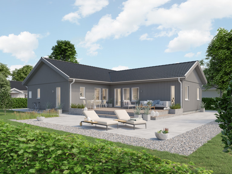 Med alle våre vinkelhus kan du skape en fantastisk uteplass beskyttet fra innsyn og vind. Her kan du drikke morgenkaffen i pysjen om du vil. Bare tenk på hvordan du plasserer huset på tomten for å få maksimalt med sol.