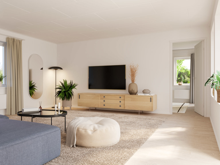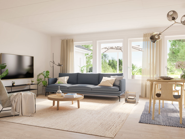 Til tross for antall soverom får kjøkken og stue god plass. 50 kvm og godt med plass til både kjøkkenøy, sofagruppe og spisebord. Legg til to romslige bad, et romslig vaskerom med egen groventré, mange oppbevaringsmuligheter og en stor walk-in-garderobe i tilknytning til et av soverommene. I sistnevnte kan du velge å sette inn en ekstra dør fra garderoben til badet om du ønsker det. I dette huset har vi også lagt til flere dekorvinduer. Disse kan du gjøre om til lange dekorvinduer som når nesten ned til gulvet. Dette og tilvalget lave vinduer gir større vindusflater og mer lys inn i huset flere steder i vinkelen. Ser du drømmehuset vokse?